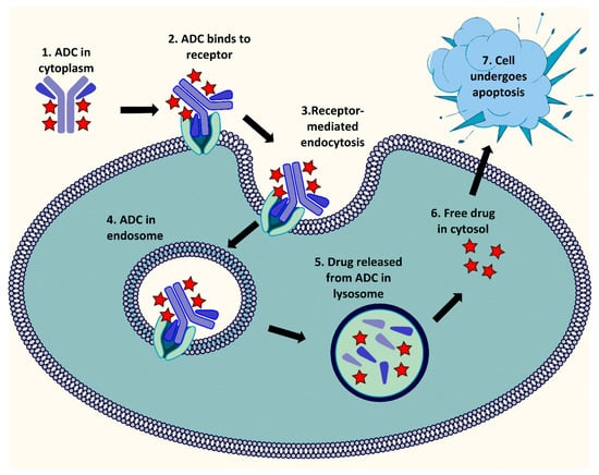 ADCs are an important class of highly potent biopharmaceutical drugs designed as prodrugs for the treatment of cancers. The drug release mechanism of ADCs consists of several key steps. The ADC first binds to the tumor-associated antigen on the target cells. The resulting antigen-ADC complex is internalized by receptor-mediated endocytosis, and subsequently transferred to late endosome and lysosome where the cytotoxic drug is released either by cleavage of the linker or degradation of the antibody. Finally, the released payload affects the intracellular target leading to apoptosis and cell death (Figure 2) [17,18,19]. This process requires concerted efforts and depends on specific properties of each ADC component, released drug ideally also has a bystander effect.
