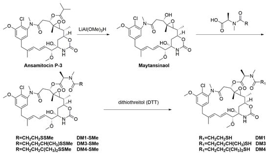 Maytansinoids are anti-mitotic tubulin inhibitors derived from maytansine (1) (Figure 5), a benzoansamacrolide that was initially isolated from an alcoholic extract in the bark of the African shrubs Maytenus serrata and Maytenus buchananii in 1972 [61]. Maytansine and maytansinoids bind to the maytansine site, resulting in the suppression of microtubule dynamics and causes cell cycle arrest in the G2/M phase. Maytansine showed potent anticancer activity in the picomolar range against most of the tested cell lines, and it was 100- to 1000-times more potent than were clinically used anticancer drugs in vitro [62]. Maytansine and its analogs were extensively evaluated in Phase I and Phase II clinical trials, with a dose limitation of 1–2 mg/m2. The dose-limiting toxicities include neurotoxicity, gastrointestinal toxicity, weakness, nausea, vomiting, and diarrhea. The poor therapeutic window and lack of tumor specificity led to the ultimate termination of the investigations on maytansine alone as an anticancer agent [63]. Due to the structural complexity including numerous stereocenters, the total synthesis of maytansine and its analogues is cost prohibitive even if it were achievable [64]. Maytansine is naturally generated from ansamitocins which were obtained from fermenting microorganism Actinosynnema pretiosum. Through a semi-synthesis strategy, a series of maytansine analogs (DM1, DM3 and DM4) bearing disulfide or thiol groups, which allow covalent linkage with mAbs, were obtained in two steps. The precursor, ansamitocin P-3 (2), was reduced by lithium trimethoxyaluminum hydride to give maytansinol (3). It was further esterified in the presence of dicyclohexylcarbodiimide and a Lewis acid (zinc chloride), to give maytansinoid disulfides, which were subsequently reduced by dithiothreitol (DTT) to yield DM1, DM3 and DM4 (Scheme 1) [65,66].