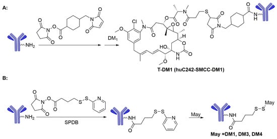 (A) conjugation of DM1 to antibodies by maleimide linker to produce antibody-SMCC-DM1 ADCs. SMCC: N-succinimidyl-4-(N-maleimidomethyl)cyclohexane-1-carboxylate; (B) conjugation of maytansinoids (May: DM1, DM3 and DM4) to antibodies by disulfide linker to produce antibody–SPDB–May ADCs. SPDB: N-succinimidyl-4-(2-pyridyldithio)butanoate.