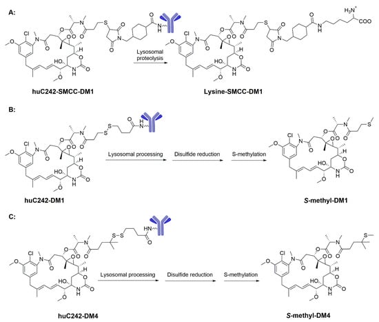 (A) antibody-SMCC-DM1 generates metabolite Lys-SMCC-DM1. SMCC: N-succinimidyl-4-(N-maleimidomethyl)cyclohexane-1-carboxylate; (B) metabolism of antibody-SPDB-DM4. SPDB: N-succinimidyl-4-(2-pyridyldithio)butanoate; (C) metabolism of antibody-SPDB-DM4.