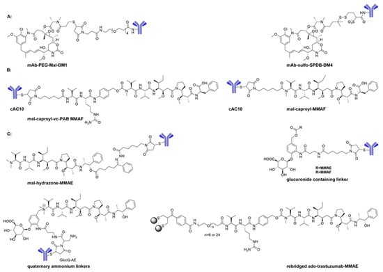 (A) the chemical structure of mAb-PEG-Mal-DM1 and mAb-sulfo-SPDB-DM4. PEG4: hydrophilic tetraethylene glycol, sulfo-PDB: sulfo N-succinimidyl-4-(2-pyridyldithio)butanoate; (B) the tubulin inhibitor MMAF-based ADCs; (C) the hydrazone functionalities, β-glucuronide containing linkers, quaternary ammonium linkers or rebridged ado-trastuzumab-based ADCs using MMAE or MMAF as payload.