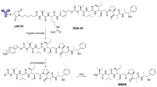 To achieve appropriate cytotoxic ADC payloads, monomethyl auristatin-E (MMAE, 8) and monomethyl auristatin-F (MMAF, 9) were designed based on the structure of auristatin. Both MMAE and MMAF showed no degradation in plasma, in human liver lysosomal environment, or by the action of proteases. As free toxins, the cytotoxicities of MMAE and MMAF are less potent than that of dolastatin 10 in lymphoma cells in vitro. The ADC conjugating MMAE or MMAF with cAC10, however, showed similar cytotoxicity against CD30+ lymphoma cells with dolastatin-10 [15,82,83,84]. In addition, MMAE and MMAF are fully synthetic drugs, which are relatively easy to modify when optimizing their physical properties and characteristics. Likewise, MMAE and MMAF are unique linear pentapeptides containing unnatural amino acids with slight modifications in the N- or C-position, and retain their potency in the form of the ADC payloads. In vitro studies concluded that MMAF was less cytotoxic than was MMAE, because the charged carboxylic acid group hinders its ability to diffuse into the cells [71,83]. Different linking strategies including acid-labile or proteolytically cleavable linkers as well as non-cleavable linkers have been evaluated in auristatin ADCs. The proteolytically cleavable linkers are introduced to keep ADCs stable in systemic circulation and allow their easy release of the cytotoxic drugs by specific intracellular proteases such as cathepsin B [85]. The ADC SGN-35 was prepared by conjugating MMAE to a CD30-specific mAb via a protease-cleavable dipeptide linker, valine–citrulline (val-cit) as stated above [17,86,87,88,89]. The val-cit peptide can be hydrolyzed through lysosomal proteases, then the paraaminobenzyl (PAB)-MMAE subsequently undergoes self-immolation to release the original MMAE (Scheme 5) [85]. This is one of the ADCs on the market approved by the FDA in August 2011.