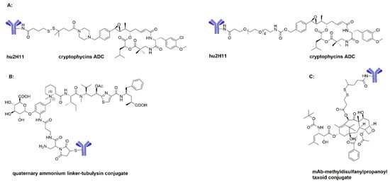 (A) the tubulin inhibitor cryptophycins-based ADCs; (B) the tubulin inhibitor tubulysins-based ADCs containing quaternary ammonium linkers; (C) the tubulin inhibitor taxoid-based ADCs.