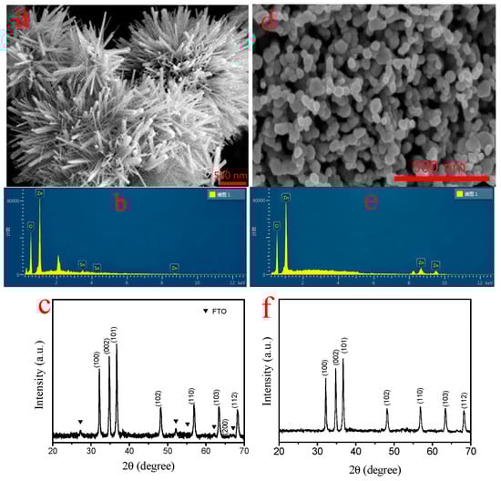 SEM photographs of (a) ZNF powder and (d) ZNP powder; EDS spectra of (b) ZNFs on FTO glass and (e) ZNP powder; XRD patterns of (c) ZNFs on FTO glass and (f) ZNP powder.