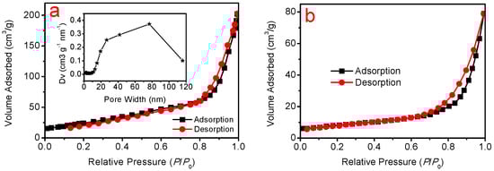 Nitrogen sorption isotherms of the photoanodes. (a) The N2 adsorption/desorption isotherms and the pore size distribution (inset) of the ZNF photoanode; (b) Nitrogen sorption isotherms of the ZNP photoanode.