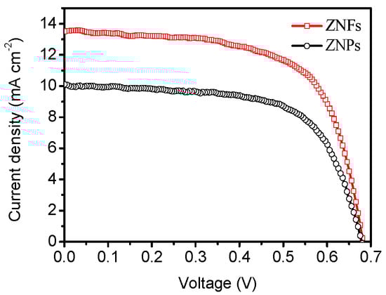 The J-V curves of the DSSCs based on ZNF and ZNP photoelectrodes.