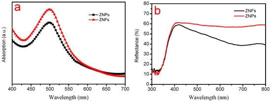 The effective dye loading of the photoelectrode was determined from the absorption value for each NaOH-dye solution according to Beer’s law [10], and the UV/Vis absorption spectra are shown in Figure 4a. The dye loading on ZNFs (1.5 × 10−7 mol cm−2) is higher than ZNPs (1.2 × 10−7 mol cm−2), which will lead to more photogenerated charge carriers and higher current density for the former. The second factor that contributed to the Jsc was the enhanced light scattering by the microstructures. A comparison of the diffuse reflectance spectra from ZNF and ZNP photoelectrodes is given in Figure 4b. Compared to the ZNP photoelectrode, the ZNF photoelectrode has higher diffuse reflection capability, thus definitely allowing a higher photocurrent [11].