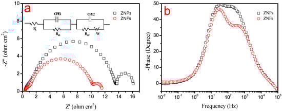 Nyquist plot and Bode phase plot of ZNF and ZNP photoelectrodes. (a) Nyquist plot (Inset gives the equivalent circuit used to fit the impedance data) and (b) Bode phase plot.