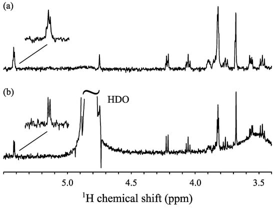 For producing neurospheres, all experimental protocols were approved by the Ethics Committee on Animal Care and Use of the RIKEN Center for Life Science Technologies (MAH22-04-5), and were performed in accordance with the Principles of Laboratory Animal Care. Brain tissue was taken from rats following application of a physical insult []. Neurospheres were obtained from the tissue by the conventional floating culture method []. Neurospheres with diameters of 100–240 μm were taken from culture dishes using a micropipette, and then culture medium was washed with 10.0 mM phosphate-buffered saline (PBS). After centrifugation (1000 g for 5 min at room temperature), the supernatant was discarded and then washed with physiological saline to remove phosphorus. Then, some samples were treated with 500 μL of methanol for removing the proteins, which simplifies NMR spectra since these broad peaks hinder the unambiguous identification of metabolites. All samples with/without methanol were concentrated by evaporation of methanol and/or physiological saline during a cooled centrifugation for 1 h. Two types of neurosphere samples (methanol-treated and non-treated) underwent the NMR analyses. Despite the existence of two types of neurospheres, the experimental procedure for both is identical. The samples were prepared from the unfiltered supernatant of swelled neurospheres, which were mixed with 6–8 µL D2O and then stirred gently. This volume of D2O was optimized to well dissolve the entire sample and to offer as high concentration of metabolites as possible. The solution was immediately used after preparation to minimize the degradation of metabolites.