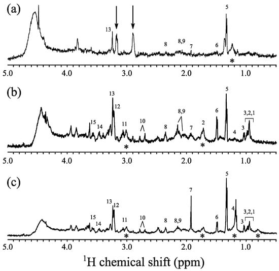 Proton 1D spectra of methanol treated (a) and untreated (b,c) neurosphere samples. All experiments were recorded by Carr–Purcell–Meiboom–Gill (CPMG) sequence with the total echo delay of 1.0 ms. The experimental times were from 15 to 20 h. The asterisk (*) denotes the lipid peak. The detailed assignments are given in Table 1.