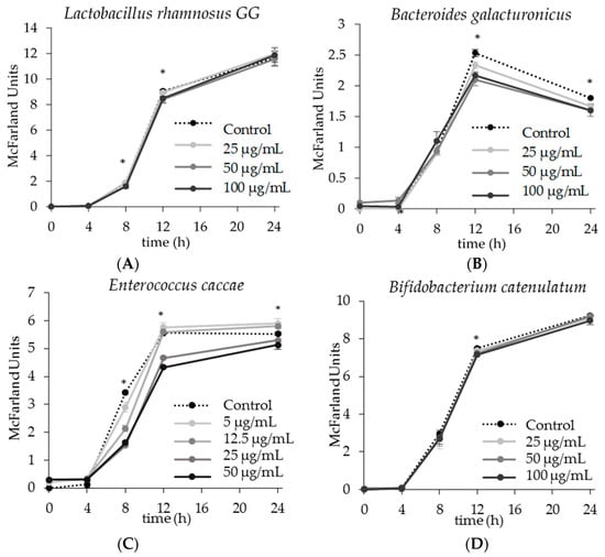 - Firrman, J.; Liu, L.; Zhang, L.; Argoty, G.A.; Wang, M.; Tomasula, P.; Kobori, M.; Pontious, S.; Xiao, W. The effect of quercetin on genetic expression of the commensal gut microbes Bifidobacterium catenulatum, Enterococcus caccae and Ruminococcus gauvreauii. Anaerobe 2016, 42, 130–141. [Google Scholar] [CrossRef] [PubMed]