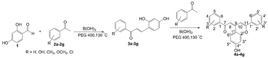 The mixture of 2,4-dihydroxybenzaldehyde (1, 1 mmol), various substituted acetophenone (2a–2g, 1 mmol), and boric acid (0.5 mmol) were dissolved in PEG-400 and then were stirred to react for 6 h at 130 °C. After the completion of the reaction, the reaction mixture was extracted with ethyl acetate three times. The collected organic layers were combined and concentrated in vacuum, and the residue was subjected to column chromatography on silica gel using CH2Cl2 (4a, 4e–4g) and CH2Cl2-MeOH (30:1, 4b–4d) as eluent to generate the pure product.