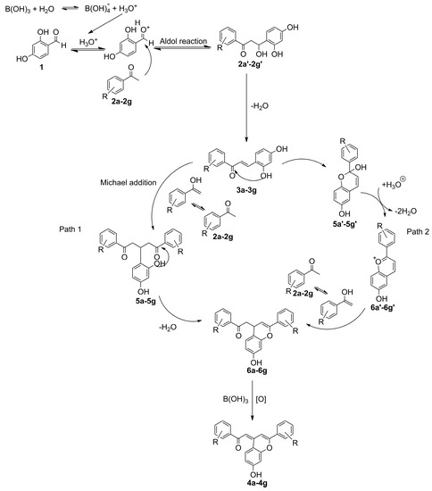 A plausible mechanism for the formation of products 4a–4g was derived and shown in Scheme 2 on the basis of the reported literature [6]. The initial step was Aldol reaction catalyzed by boric acid between 2,4-dihydroxybenzaldehyde (1) and substituted acetophenones (2a–2g) and firstly led to the products of 2′,4′-dihydroxychalcones (3a–3g). The mechanism in path 1 involved in a Michael addition between substituted acetophenone (2a–2g) and 2′,4′-dihydroxychalcones (3a–3g) to offer the products 5a–5g. The products 5a–5g further underwent intramolecular cyclization, followed by dehydration to form adducts (6a–6g) and then were oxidized to form the product 4a–4g. The other plausible mechanism in path 2 involved in intramolecular cyclization of 2′,4′-dihydroxychalcones (3a–3g) to form their hemiacetal species 5a′–5g′, which were then converted to more reactive flavylium ions (6a′–6g′). The flavylium ions (6a′–6g′) further reacted with substituted acetophenone (2a–2g) to form adducts (6a–6g). Finally, adducts were oxidized to form the products 4a–4g, probably through a disproportionation mechanism suggested by VanAllen [8], which also accounted for the low yield of 4-phenacylideneflavene.