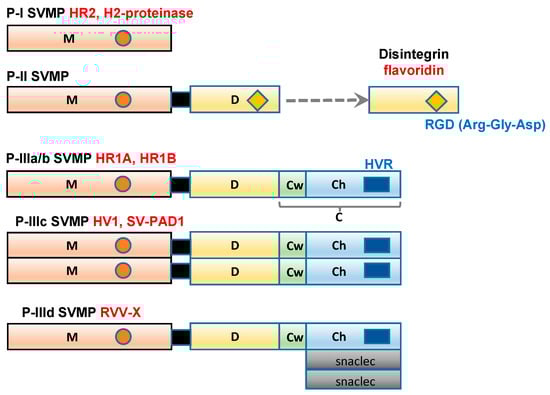 SVMP range in size from 20 to 100 kDa and have been classified into three groups, P-I to P-III (Figure 1), according to their domain structures [13]. Class P-I SVMP are the smallest SVMP, as they only contain an M domain (position 1–214). Class P-II SVMP contain a canonical D domain (position 219–307), which is connected by a sort spacer region to the carboxyl terminus of the M domain. Class P-III SVMP contain a C domain (position 308–432), which is located on the carboxyl side of the D domain. Single-chain class P-III SVMP, including the HR1A and HR1B isolated from P. flavoviridis venom [14,15], have been subclassified as P-IIIa. In addition, P-III SVMP have been further divided into subclasses based on their post-translational modifications, such as whether they are subjected to dimerization (P-IIIc) or proteolytic processing (P-IIIb). P-IIId SVMP, for example, a specific factor X activator derived from Russell’s viper (Daboia russelli) venom (RVV-X) contains an additional C-type lectin-like domain [16,17].