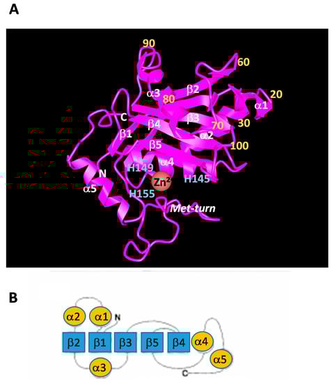 (A) Three-dimensional structure of the M domain of an H2-proteinase derived from Protobothrops flavoviridis venom [19]. α1–α5: α-helices; β1–β5: β-sheet; Yellow number shows amino acid position; Light blue shows His residues in Zn2+-binding sequence; (B) Topological packing diagrams for H2-proteinase derived from P. flavoviridis venom.