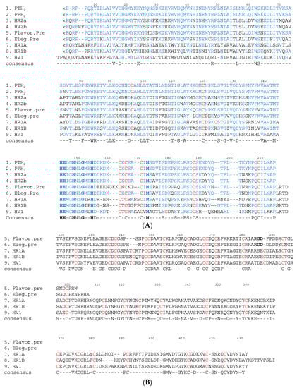Comparison of the amino acid sequences of PT-H2 with those of other Protobothrops venom metalloproteinases. (A) Amino acid sequences of the M domains of SVMP; (B) Amino acid sequences of the DC domains of P-II and P-III SVMP. Gaps have been introduced to facilitate comparisons of sequence similarity. <E is pyroglutamic acid. The cysteine residues are shown in red. The binding site for Zn2+ and the Met-turn amino acid residues are shown in bold. The amino acid sequence of PT-H2 and the conserved amino acid residues are shown in blue. M domain: position 1–214; D domain: position 219–307; C domain: position 308–432; PTH2: a non-hemorrhagic P-I SVMP derived from P. tokarensis venom [20]; PFH2: a non-hemorrhagic P-I SVMP derived from P. flavoviridis venom [21]; HR2a [22] and HR2b [23]: hemorrhagic P-I SVMP derived from P. flavoviridis venom; Flavor. pre: a flavoridin precursor (a disintegrin) derived from P. flavoviridis venom [24]; Eleg. pre: a precursor of elegantin (a disintegrin) derived from P. elegans venom [25]; HR1A and HR1B [14]: hemorrhagic P-IIIa/b SVMP derived from P. flavoviridis venom; HV1 [26]: an apoptotic P-IIIc SVMP derived from P. flavoviridis venom