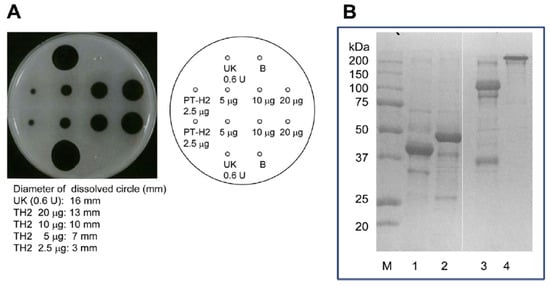 Effect of PT-H2 on bovine fibrin plates and SDS-PAGE of solutions that had been dissolved using PT-H2 or urokinase. (A) Fibrinolytic activity of PT-H2 and urokinase (as a positive control); (B) SDS-PAGE (Laemmli, 10% gel, Coomassie Brilliant Blue staining) of solutions that had been dissolved using PT-H2 (lane 2: reducing conditions, lane 4: non-reducing conditions) or urokinase (lane 1: reducing conditions, lane 3: non-reducing conditions). The assay of fibrinolytic activity was measured using the fibrin plate. A fibrin plate was prepared by the following methods. Bovine fibrinogen solution (16 mL, 10 mg/mL) in 0.02 M Tris-HCl buffer (pH 7.5) containing 0.15 M NaCl and 5 mM CaCl2 was poured in a plate (internal diameter: 94 mm). Then thrombin solution (100 μL, 100 units/mL) was added to the plate, and clotted at 30 °C for 2 h. Sample solution containing the protein applied to the well, and incubated at 25 °C overnight. After incubation, the fibrin plate was washed with saline three times, and then circle diameters dissolved by fibrinolytic enzyme and by urokinase as positive control were measured, respectively. Fluid from each circle dissolved by PT-H2 protease or urokinase was sampled and then subjected to SDS-PAGE.