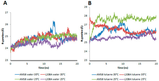 The radius of gyration, Rg (measure of the mass-weighted spatial distribution of the atoms in a peptide molecule/protein and a rough measure for its compactness) in WT AMS8 and mutant L208A in water—(A) and toluene—(B) (at 25 °C and 35 °C) respectively.