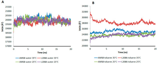 The accessible surface areas of atoms are correlated with their hydrophobicity and folding process. The folding process is usually accompanied by a significant decrease in SASA value. In water simulation, both WT AMS8 and L208A lipase showed to have similar SASA pattern at 25 °C and 35 °C, which is indicative of having no difference in the folding process (Figure 2A). However since toluene was added into the simulation, the average value of SASA increased by 1 to 1.5 times (Figure 2B). Even though both WT and L208A lipases exhibited an increase in SASA when simulated at 35 °C, the latter one was shown to have undergone maximum local rearrangements that modify the energy interactions with the solvent which could influence the state of protein folding itself.