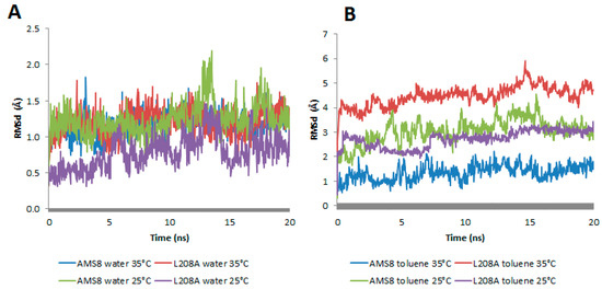 The root-mean-square (RMSd) distance between the Cα atoms in the simulations and the lid 2 (148–167) structure of AMS8 and its mutant L208A in water—(A) and toluene—(B) at 25 °C and 35 °C respectively.