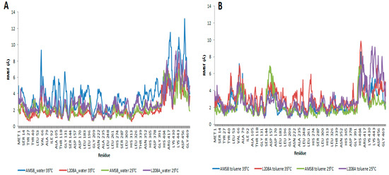 The root-mean-square (RMSf) distance between the Cα atoms in the simulations and the protein structure of AMS8 and its mutant L208A in water—(A) and toluene—(B) at 25 °C and 35 °C respectively.