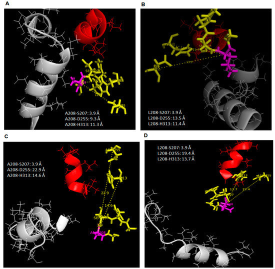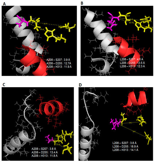 Distance of L208/A208 with catalytic triad S207, D255, H313 in 25 °C simulation. Image (A,C) referred to L208A simulated in water and toluene while (B,D) pointed to AMS8 lipase simulated in water and toluene. Lid 1 (51–57) was represented in red helix, lid 2 (148–167) was in grey helix, L208/A208 residue in purple stick and catalytic triads (Ser-207, Asp-255, His-313) were identified as yellow sticks.
