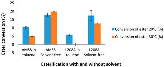 Esterification conversion rate of mutant L208A with and without toluene using 5 mg of protein per reaction at 20 °C and 30 °C.