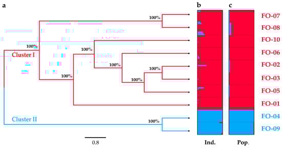 - Falush, D.; Stephens, M.; Pritchard, J.K. Inference of population structure using multilocus genotype data: Dominant markers and null alleles. Mol. Ecol. Resour. 2007, 7, 574–578. [Google Scholar] [CrossRef] [PubMed]