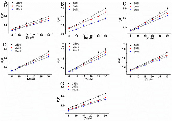 Stern–Volmer plots for BSA (5 μM) quenched by compounds 1 (A), 2 (B), 3 (C), 4 (D), 5 (E), 6 (F), and 7 (G) at different temperatures in 0.05 mol L−1 Tris-HCl, pH 7.4. The concentrations of compounds varied from 0 to 30 μM.