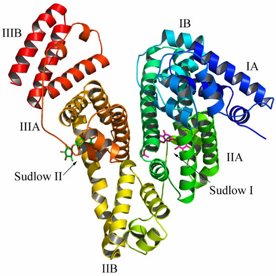 - Sekula, B.; Zielinski, K.; Bujacz, A. Crystallographic studies of the complexes of bovine and equine serum albumin with 3,5-diiodosalicylic acid. Int. J. Biol. Macromol. 2013, 60, 316–324. [Google Scholar] [CrossRef] [PubMed]