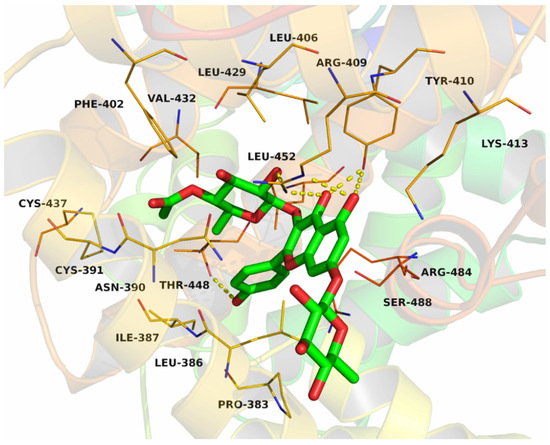 Compound 6 was docked into the Site II (IIIA site) and Site I (IIA site) binding sites of the BSA, respectively (Figure 10). The detailed binding mode of compound 6 to the Site II binding site in subdomain IIIA of the BSA was shown in Figure 11. The acetyl group of compound 6 fit at the bottom of the BSA pocket and made a high density of van der Waals contacts, whereas the rhamnopyranosyl group of compound 6 was positioned at the entrance of the pocket and makes only a few contacts. Detailed analysis showed that the acetyl group of compound 6 stretched into the hydrophobic pocket that consisted of Cys-391, Phe-402, Val-432 and Cys-437, while the 4-hydroxylphenyl group of compound 6 was located at another hydrophobic pocket, surrounded by the residues Pro-383, Leu-386, Ile-387 and Leu-452, forming a stable hydrophobic binding. In addition, cation-π interactions were observed between the kaempferol scaffold of compound 6 and the residues Arg-409, Lys-413 and Arg-484. Importantly, six hydrogen bond interactions were observed between the compound 6 and the residues Thr-448, Arg-409 and Tyr-410 of the BSA.