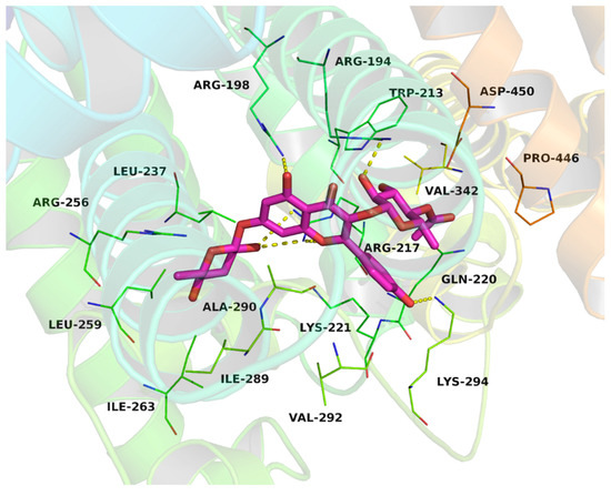 To gain further insight into the binding interaction between compound 6 and the BSA in the molecular level, compound 6 was docked to the Site I of the BSA (Figure 12). The rhamnopyranosyl group of compound 6 fit at the bottom of the BSA pocket and made a high density of van der Waals contacts, whereas the other two sides of compound 6 were positioned near the entrance of the pocket and makes only a few contacts. Detailed analysis showed that the acetyl group of compound 6 stretched into the hydrophobic pocket that consisted of Trp-213, Val-342 and Pro-446, while the kaempferol scaffold of compound 6 was located at the hydrophobic pocket, surrounded by the residues Ile-289, Ala-290 and Val-292, forming a stable hydrophobic binding. Moreover, cation-π interactions were observed between the kaempferol scaffold of compound 6 and the residues Arg-194, Arg-198, Arg-217, Lys-221 and Lys-294. Importantly, six hydrogen bond interactions were observed between the compound 6 and the residues Arg-194, Arg-198, Arg-217, and Lys-294. All of these interactions helped compound 6 to anchor in the binding site of BSA. Molecular docking analysis suggests a better binding interaction for compound 6 with site I, and this is consistent with the results of competitive binding assay.