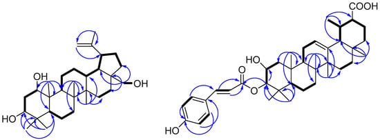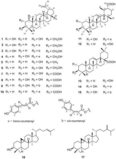 In addition to the new compounds, a spectroscopic data comparison with the literature allowed the known compounds to be identified as lupeol (5) [15,16], betulin (6) [11,17], betulinic acid (7) [11,18], alphitolic acid (8) [19], 3β-O-cis-p-coumaroyl alphitolic acid (9) [20,21], 3β-O-trans-p-coumaroyl betulinic acid (10) [22], dulcioic acid (12) [14], oleanolic acid (13) [23], 3β-O-trans-p-coumaroyl maslinic acid (14) [24], 3β-O-cis-p-coumaroyl maslinic acid (15) [25], cycloartenol (16) [26], and 24-methylenecycloartenol (17) [26], respectively.