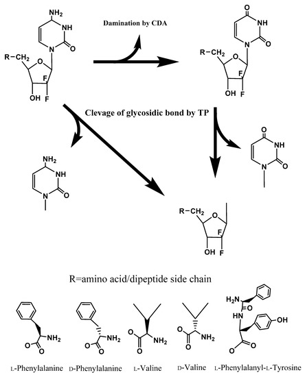 - Tsume, Y.; Incecayir, T.; Song, X.; Hilfinger, J.M.; Amidon, G.L. The development of orally administrable gemcitabine prodrugs with d-enantiomer amino acids: Enhanced membrane permeability and enzymatic stability. Eur. J. Pharm. BioPharm. 2014, 86, 514–523. [Google Scholar] [CrossRef] [PubMed]