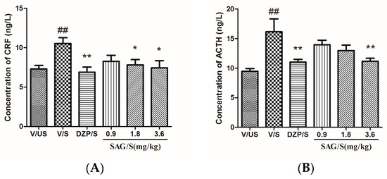 As shown in Figure 3, the one-way ANOVA revealed significant differences in the concentration of CRF (F(5,54) = 3.377, p < 0.05), ACTH (F(5,54) = 5.092, p < 0.01), and CORT (F(5,54) = 6.625, p < 0.01). With the acute restraint stress, the V/S group significantly increased the content of plasma CRF, ACTH, and CORT compared with the V/US group (all p < 0.01). Diazepam treated rats could significantly decrease the plasma CRF, ACTH, and CORT level compared with the V/S group (all p < 0.01). SAG at the doses of 1.8 and 3.6 mg/kg could significantly decrease the plasma CRF level (p < 0.05). The level of ACTH could be significantly decreased by SAG at the dose of 3.6 mg/kg, and the level of CORT could be significantly decreased by SAG at the doses of 0.9, 1.8, and 3.6 mg/kg. (Supplementary materials are available online).