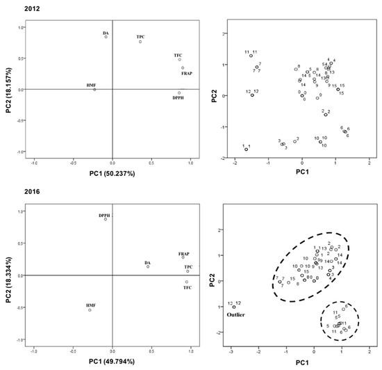 Principal Component Analysis (PCA) - Biplot of scores and loadings of data obtained from HMF, DA, and antioxidant parameters (TPC, TFC, DPPH• SA, FRAP) of the honey samples analysed in 2012 and 2016 (left: PCA distribution of variables; right: PCA distribution of honey samples).