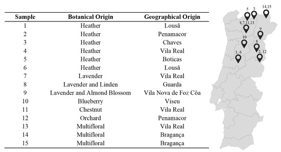 Fifteen honey samples, from distinct botanical origins and produced in 2012, were acquired in the North and Centre of Portugal. Samples were acquired in labelled glass containers, with at least 500 g of honey, directly from producers. A detailed description of the samples is presented in Figure 2. After purchase, samples were immediately analysed, according to the following sections. The influence of storage time on the studied properties were evaluated after 4 years (in 2016). This period was selected considering the maximum storage validity mentioned on the labels of the analysed samples. During this period, samples were stored in the original package at controlled temperature (25 °C) in the dark. This temperature was selected considering the normal storage conditions mentioned on the labels.