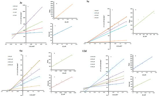 Double reciprocal plot for inhibition of urease in the existence of inhibitor 3e: (A) Doses of 3e were 0.025, 0.05, 0.01 and 0.02 µM. Substrate urea concentrations were 100, 50, 25, 12.5, 6.25 and 3.125 mM; (B) The graph indicates the plot of the slope (C) the vertical intercepts versus inhibitor 3e concentrations to determine inhibition constants. Double reciprocal plot plots for inhibition of urease in the presence of Compound 6a: (A) Concentrations of 6a were 0.00, 0.0011, 0.0022 and 0.0044 µM. Substrate urea concentrations were 100, 50, 25, 12.5, 6.25, and 3.125 mM; (B) The insets represent the plot of the slope (C) the vertical intercepts versus inhibitor 6a concentrations to determine inhibition constants. Lineweaver–Burk plots for inhibition of urease in the presence of Compound 9e: (A) Concentrations of 9e were 0.00, 0.015, 0.03 and 0.06 µM. Substrate urea concentrations were 100, 50, 25, 12.5, 6.25, and 3.125 mM; (B) The insets represent the plot of the slope. Lineweaver–Burk plots for inhibition of urease in the presence of Compound 12d: (A) Concentrations of 12d were 0.013, 0.026, 0.052, 0.104 and 0.208 µM. Substrate urea concentrations were 100, 50, 25, 12.5, 6.25 and 3.125 mM; (B) The insets represent the plot of the slope (C) the vertical intercepts versus inhibitor 12d concentrations to determine inhibition constants.