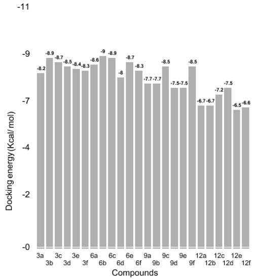 To predict the best fitted conformational position of the synthesized compounds 3a–f, 6a–f, 6a–f and 12a–f against the targeted protein, their generated docked complexes were analyzed on the basis of minimum energy values (Kcal/mol) and bonding interaction patterns (hydrogen/hydrophobic). Among the four different ligand structures, the docking results justified the fact that compounds 3a–f and 6a–f were the most active with better binding energy values as compared to 9a–f and 12a–f. The comparative analysis showed that 6b has the highest energy value (9.0 Kcal/mol) complex. Compound 6a also has a good binding energy affinity (8.6 Kcal/mol). The docking results showed that compounds 6a–f have more binding potential against the target protein. Similarly, some other compounds like 3b, 9c, 9f, 12c and 12d also possess good binding energy values (−8.9, −8.5, −8.5, −7.2 and −7.5 Kcal/mol, respectively). However, all the other compounds also exhibited good binding energy values (Kcal/mol) against the receptor molecule. A literature study showed that the standard error mean of docking energy for Autodock is 2.5 kcal/mol. Therefore, among all compounds the energy value difference was no more than 2.5 Kcal/mol. However, the selection of compounds was also confirmed on the basis of in vitro analysis to categorize the compounds and further perform a dynamic simulation study. Our computational analysis also showed a good association with the in-vitro study and a graphical depiction is provided in Figure 3.