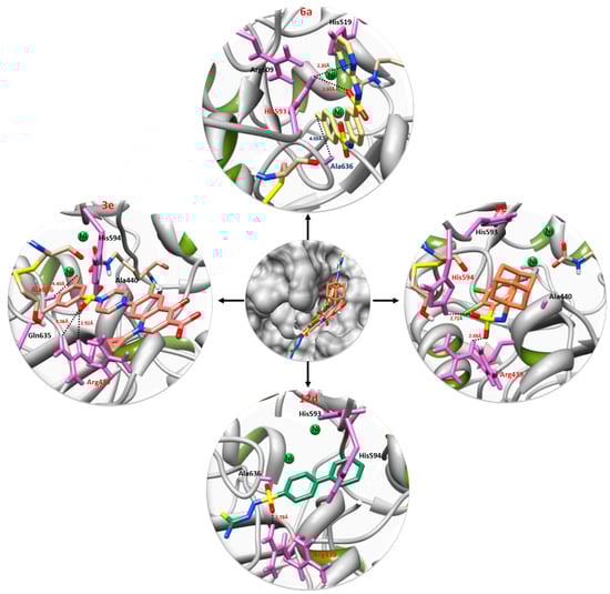 The hydrogen and hydrophobic interactions are very important in drug protein docking. Prior research data showed that hydrogen bonds with donor-acceptor distances of 2.2–2.5 Å are considered as strong bonds, while, bond distances from 2.5 to 3.2 Å are considered moderate, and bond lengths ranging from 3.2–4.0 Å are considered as weak interactions [40]. In detail, the structure activity relationship (SAR) study showed that in 6a docking two hydrogen bonds were observed against His593, with bond distances of 2.30, 2.60 Å, respectively [41]. However, another showed that the default parameter for the distance between the hydrogen bond donor and the acceptor was 3.2 Å [42]. On average, a hydrogen bond with a distance >3.5 Å is considered as weak and a hydrogen bond with a distance <3.5 Å is considered strong [43]. A single hydrophobic interaction was also seen with Ala636, showing a bond length of 4.03 Å. The amino group of the benzene ring and oxygen moiety of the sulfur interact directly with His593 by a hydrogen bond interaction. Similarly, the benzyl methyl group forms a hydrophobic interaction within the active binding region of the target protein. In the 3e docking complex three hydrogen bonds were observed. The oxygen and methoxy functional groups of 3e form hydrogen bonds with Arg439 and Ala636 with bonding distances of 3.06, 2.92 and 4.40 Å, respectively. Compounds 9e and 12d are also involved in hydrogen bonding interactions with target protein residues. The oxygen moiety of 9e forms double hydrogen bonds with Arg439 and His594 with bonding distances of 2.08 and 2.72 Å. Similarly, in 12d docking a single hydrogen bond was observed between Arg439 and an oxygen molecule of the ligand with a bonding distance 1.78 Å. It has been observed that Arg439 was most common interacting residues in all docking results. Literature data also verified the importance of these residues in bonding with other urease inhibitors which strengthens our docking results. No ligand interaction was observed with the Ni2+ due to the bulky ligand structures. However, the interaction patterns of our docking results were correlated with published results which strengthens the significance of our docking experiments [44,45,46,47,48]. The comparative binding energy and SAR analysis showed the significance of 6a that may be considered as a potent inhibitor targeting jack bean urease.