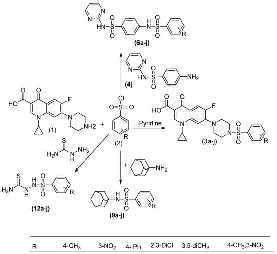 Synthesis of ciprofloxacin-appended sulfonamide derivatives 3a–3f, sulfadiazine drug derivatives 6a–6f, amantadine-linked sulfonamides 9a–9f and thiosemicarbazide sulfonamide derivatives 12a–12f.