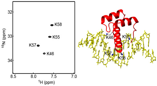 - Anderson, K.M.; Nguyen, D.; Esadze, A.; Zandrashvili, L.; Gorenstein, D.G.; Iwahara, J. A chemical approach for site-specific identification of NMR signals from protein side-chain NH3+ groups forming intermolecular ion pairs in protein-nucleic acid complexes. J. Biomol. NMR 2015, 62, 1–5. [Google Scholar] [CrossRef] [PubMed]