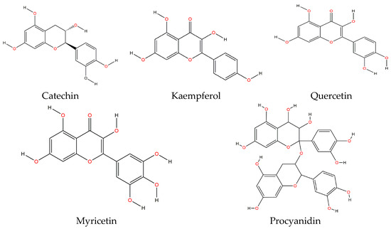 Flavonoids contained on the common bean are phenolic compounds that have been reported to act as inhibitors of tumor growth and some cancer types. These, along with phenolic acids and tannins, confer to this food a superior antioxidant capacity [9,49]. Flavonoids share a common structure consisting of two aromatic rings that are linked through three carbons, forming an oxygenated heterocycle. These are classified in six subclasses, depending on their heterocycle: flavonols, flavones, isoflavones, flavanones, anthocyanidins and flavanols (catechin and proanthocyanidin or condensed tannins). The main flavonoids contained in both raw and cooked bean are catechin, kaempferol, quercetin, myricetin and procyanidin [49] (Figure 2).