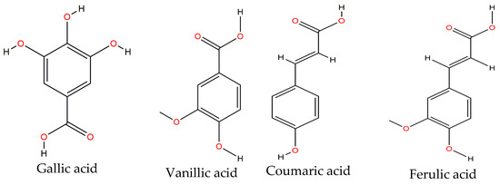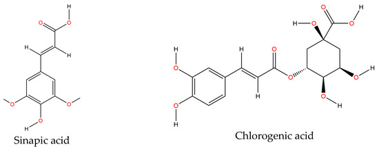 Phenolic acids are of great importance in vegetables as they are precursors of other more complex phenolic compounds. These may be classified in two types: those derived from benzoic acid (e.g., p-hydroxybenzoic, vanillic and gallic acids) and those derived from cinnamic acid (e.g., ferulic, p-coumaric, and caffeic acids) [57]. Gallic, vanillic, coumaric, sinapic, ferulic and chlorogenic acids (Figure 3) are mainly found on the common bean, either raw or cooked. A study conducted by Espinosa-Alonso et al. [14] showed that ferulic acid is the main phenolic acid on 62 lines of the wild-type Mexican bean.