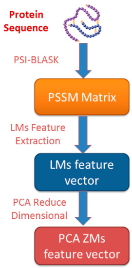 As a result, we obtained 441 features by using Legendre moments on PSSM of a given protein sequence. Therefore, each protein pair contains 882 features. The principal component analysis (PCA) method was employed to reduce the influence of noise and obtain distinguishing features. PCA transforms the feature into a new coordinate system, so that the maximum variance of the feature projection is located on the first coordinate. Finally, each protein pair was represented by only 100 features [42,43,44]. The flowchart of the proposed feature extraction scheme is displayed in Figure 1.