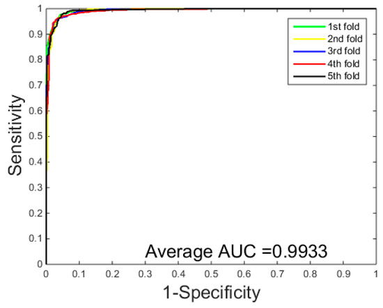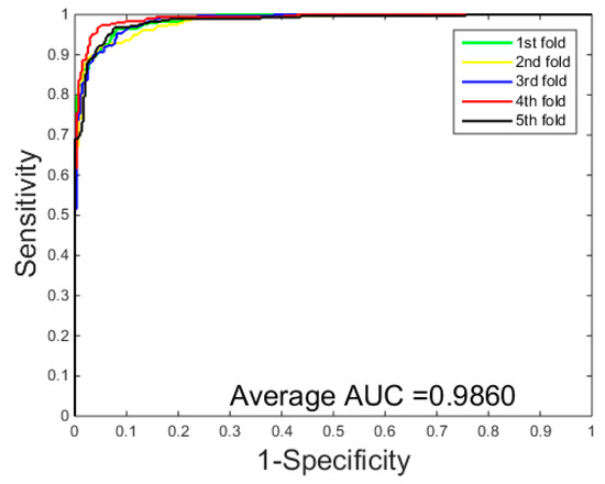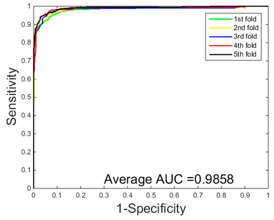 When the proposed method was applied to detect PPIs on the Yeast dataset, it can be seen from Table 1 that we obtained the results of average accuracy, precision, sensitivity, and MCC of 96.37%, 96.60%, 96.15% and 93.00%, respectively. They standard deviations are 0.2%, 0.6%, 0.5% and 0.4%, respectively. When using the proposed method to predict PPIs on the H. pylori dataset, as can be seen from the Table 2, the proposed method also yielded good results of average accuracy, precision, sensitivity, and MCC of 93.48%, 94.40%, 95.46% and 87.79% and the standard deviations are 0.2%, 2.2%, 2.3% and 0.4%, respectively. The ROC curves performed on the two datasets are shown in Figure 2 and Figure 3. In order to further assess the performance of the PCVM method, the AUC values were calculated whose averages of the Yeast and H. pylori datasets are 99.33% and 98.60%, respectively.