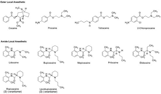 The earliest use and cultivation of coca, a shrub of the genus Erythroxylum, in the Andean region of South America, are very likely to date back to several thousand years B.C. [8]. However, a pain-relieving substance had been neither structurally identified nor clinically applied until the leaves of Erythroxylum coca (Erythroxylaceae) were taken from Peru to Europe. In 1860, Albert Niemann in Göttingen reported that chewing coca leaves took away tongue feeling and taste. He isolated an active substance from them and named it as “cocaine”. Sigmund Freud, the founder of psychoanalysis, read Niemann’s report and considered using cocaine to overcome morphine addiction. He encouraged his colleague Carl Koller, a resident in ophthalmology in Vienna, to take part in the study of cocaine. Koller experimented on animals and humans by dropping a cocaine solution onto the eyeballs and found the numbing effect of cocaine on the eye. Shortly thereafter, he successfully performed cataract surgery using cocaine as a topical anesthetic in 1884 [9]. After his first clinical introduction, modern local anesthesia began with the development of injectable cocaine and its use for spinal anesthesia. In 1898, Richard Willstätter structurally identified cocaine as methyl (1R,2R,3S,5S)-3-(benzoyloxy)-8-methyl-8-azabicyclo[3.2.1]octane-2-carboxylate (Figure 1). However, as undesirable (toxicity and addiction) and problematic (short duration and difficult sterilization) properties of cocaine became apparent, its molecular structure was modified to obtain safer and more effective drugs. In 1904, Alfred Einhorn synthesized procaine to replace cocaine, followed by a series of synthetic drugs: tetracaine, lidocaine, 2-chloroprocaine, bupivacaine, mepivacaine, prilocaine, etidocaine, ropivacaine and levobupivacaine (Figure 1). Local anesthetics derived from plant alkaloid cocaine, especially amide-type drugs, have been successfully used in a wide range of situations to relieve and control pain. The most widely recognized mode of action for local anesthetics is the interaction with voltage-gated Na+ channels to inhibit sensory and motor functions [10]. Anesthetic molecules penetrate through the lipid barriers of nerve sheaths and diffuse across the lipid bilayers of cell membranes so that they access the intracellular or cell-interior binding sites on Na+ channels embedded in membranes. Local anesthetics also diffuse into lipid bilayers and act on membrane-constituting lipids, modifying the physicochemical properties of neuronal and cardiomyocyte membranes [11].