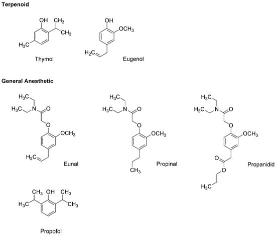 Thymol (2-isopropyl-5-methylphenol) and eugenol (4-allyl-2-methoxyphenol) (Figure 2) are contained in thyme (Thymus vulgaris, Lamiaceae) and clove (Syzygium aromaticum, Myrtaceae), respectively, both of which are well-known for culinary and medicinal uses. Eugenol also occurs in herbs such as nutmeg (Myristica fragrans, Myristicaceae), cinnamon (Cinnamomum verum, Lauraceae) and basil (Ocimum basilicum, Lamiaceae). Because these terpenoid phenols possess antinociceptive and antibacterial effects, they have been extensively used in dental practice as a sedative or analgesic agent for pulpitis, toothache and dental hyperalgesia. In addition, thymol, eugenol and their structurally-related compounds exhibit general anesthetic activity.