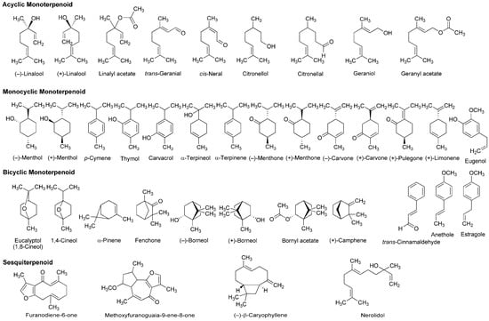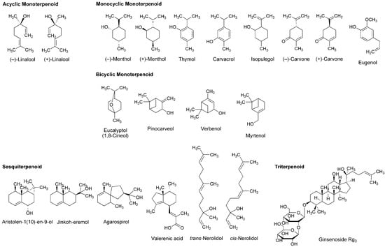 Essential oils, the concentrated liquids of a highly complex mixture of volatile phytochemicals, are generally extracted from aromatic plants, including citrus peel and caraway. In addition to the utility as perfume and flavor, the medicinal property has been suggested for essential oils from peppermint, lavender, eucalyptus, rosemary, thyme, nutmeg and chamomile. Terpenoids occupy more than 90% of phytochemicals contained in the essential oils. Their structures consisting of five-carbon (C5) isoprene units are classified by the number of C5 unit into monoterpenoids with 2 × C5 unit, sesquiterpenoids with 3 × C5 unit, diterpenoids with 4 × C5 unit and triterpenoids with 6 × C5 unit. Monoterpenoids are composed of acyclic (open-chain), monocyclic and bicyclic structures. Excellent reviews were recently published for the pharmacological effects of essential oils and their component terpenoids by de Sousa [25] and Guimarães et al., [26], and for the therapeutic benefits of essential oils by Djilani and Dicko [27].