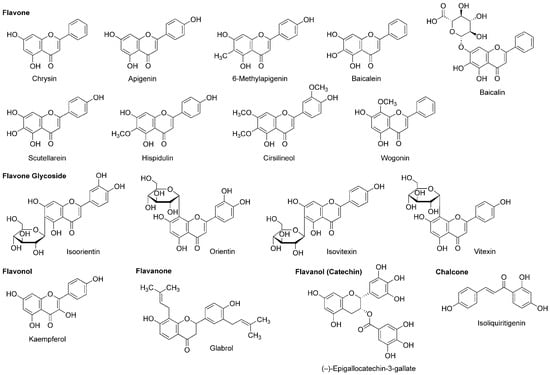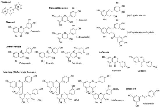Flavonoids are polyphenolic phytochemicals that ubiquitously occur in edible and medicinal plants. A number of flavonoids are structurally derived from the parent compound with a tricyclic (C6–C3–C6) skeleton, sharing a benzene ring A condensed with a heterocyclic six-membered ring C that carries a phenyl ring B at the 2-position for flavonoids (Figure 5). Based on a structural variation of C ring and its substituents, flavonoids are divided into several subclasses of flavone, flavonol (3-hydroxyflavone), flavanone (dihydroflavone), flavanonol (dihydroflavonol), flavanol (catechin), anthocyanidin with the backbone of 1-benzopyrylium instead of 1-benzopyran-4-one, chalcone lacking the C ring, and isoflavone with the B ring at the 3-position.